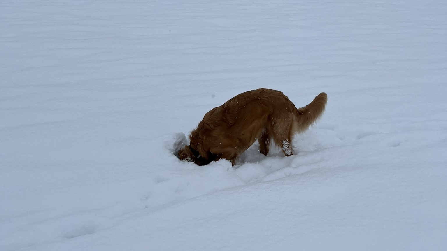 Luna, eine Golden Retriever-Hündin aus Ravensburg, nimmt beim Apportieren automatisch kleine Mengen Schnee auf. Solange das in Maßen passiert, macht ihr das keinerlei Probleme – es gehört für sie einfach zum Winterspaß dazu.